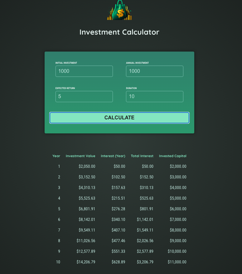 The Investment Calculator App was built to help users calculate simple interest over a period of years.